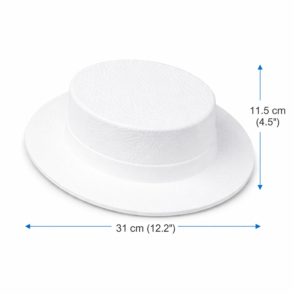 Gracias a sus dimensiones de 31 x 27 cm, este sombrero de unicel es perfecto para decoración de eventos temáticos, exhibiciones comerciales, escenografías, disfraces, manualidades, proyectos escolares y trabajos artísticos. Su superficie es ideal para pintar, forrar y decorar con materiales como tela, papel, vinil, foamy, diamantina o pintura acrílica, facilitando la personalización según el concepto creativo.